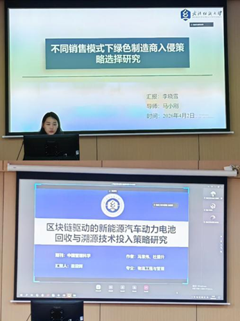 李晓雪同学分享了《不同销售模式下绿色制造商入侵策略选择研究》,不同销售模式下绿色制造商入侵策略选择研究。翁迎辉同学围绕《区块链驱动的新能源汽车动力电池回收与溯源技术投入策略研究》,运用Stackelberg博弈模型研究区块链驱动的动力电池回收溯源技术投入策略,发现该技术对供应链主体利润的影响规律及高追溯水平的积极价值。