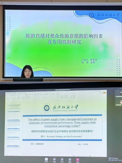 秦梦洁同学以《旅游直播对观众旅游意愿的影响因素及作用机制研究》为题,旅游直播对观众旅游意愿的影响因素及作用机制研究。陈宇豪同学汇报了《The effect of green supply chain management practices on corporate environmental performance: Does supply chain competitive advantage matter?》,基于陕西省 710 家企业数据实证分析,发现高层管理支持、绿色供应链管理实践等正向影响企业环境绩效,供应链竞争优势在制度压力与环境绩效间起调节作用。