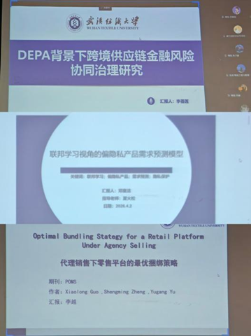 李蓓莲分享了《DEPA背景下跨境供应链金融风险协同治理研究》,以DEPA数字贸易规则为背景,识别跨境供应链金融四大风险维度并构建评估体系,提出六方协同治理框架与三维治理模式,为风险防控提供参考。邓童洁同学分享了《联邦学习视角的偏隐私产品需求预测模型》,针对偏隐私产品需求预测的隐私与准确性难题,构建基于联邦学习的深度强化学习模型,结合多源数据提升了预测准确性且实现数据隐私保护。李越同学报告了《Optimal Bundling Strategy for a Retail Platform Under Agency Selling》构建平台型电商代理销售模式下的斯塔克尔伯格博弈模型,分析得出平台捆绑销售的适用条件及供应商定价、平台佣金率的相关影响规律。