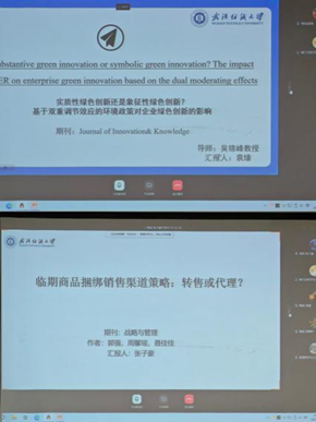 袁缘同学分享的《Substantive green innovation or symbolic green innovation? The impact of ER on enterprise green innovation based on the dual moderating Effects》以A股上市企业面板数据为基础,通过三重差分模型研究发现环境规制正向影响企业绿色创新,监管捕获是导致实质性与象征性绿色创新差异的关键因素。张子豪报告的《临期商品捆绑销售渠道策略:转售或代理?》,聚焦临期商品销售构建四种供应链模型,分析得出渠道选择由临期程度主导,捆绑效应的作用取决于商品剩余价值,为临期商品供应链绿色协同提供策略。