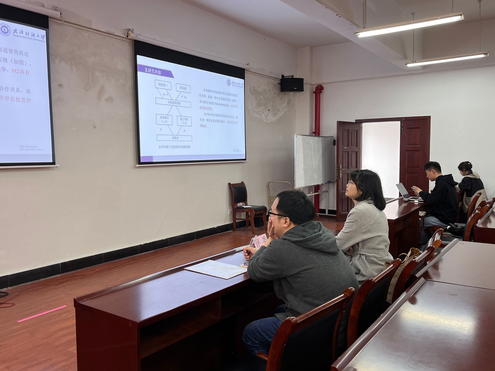 第一位分享的是来自22级的李德伟同学,介绍了论文《竞合环境下考虑绿色满意度的全渠道供应链定价与投资决策研究》,本文以全渠道供应链为对象,构建博弈模型,对最优决策和利润进行比较分析,探究在竞合环境下消费者对产品绿色度有不同要求时,企业对于全渠道营销策略以及绿色研发的战略选择。接下来是来自22级的杨雅娴同学,对《基于荟萃分析的掠夺性期刊的识别》作了汇报,其论文采用荟萃方法,提取了低拒稿率、影响因子、期刊出版领域广度、发文量大、快速出版和版面费高等六个指标,以判断期刊的掠夺性程度。该研究为期刊质量管理提供了一种新的方法。随后,来自22级的唐鼎峰同学对论文《乡村振兴背景下农业供应链金融多维返贫动态治理机制探究》进行了展示,本文在已有学者的研究基础上,基于PCA-LOGIT的方法构建了脱贫农户返贫风险多维测度模型,梳理出以农业供应链金融为主要手段的农户多维返贫动态治理机制。